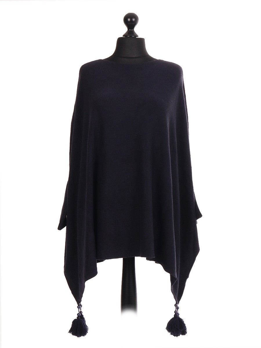 Elevate your wardrobe with the navy Italian Batwing Tassels Poncho. Crafted with expert attention to detail, this poncho features a flowing batwing silhouette that offers both comfort and style. The delicate tassel accents add a refined touch, making it a versatile piece for layering in cooler weather. Perfect for those seeking a sophisticated yet relaxed look, this poncho combines Italian design elegance with practical wearability.