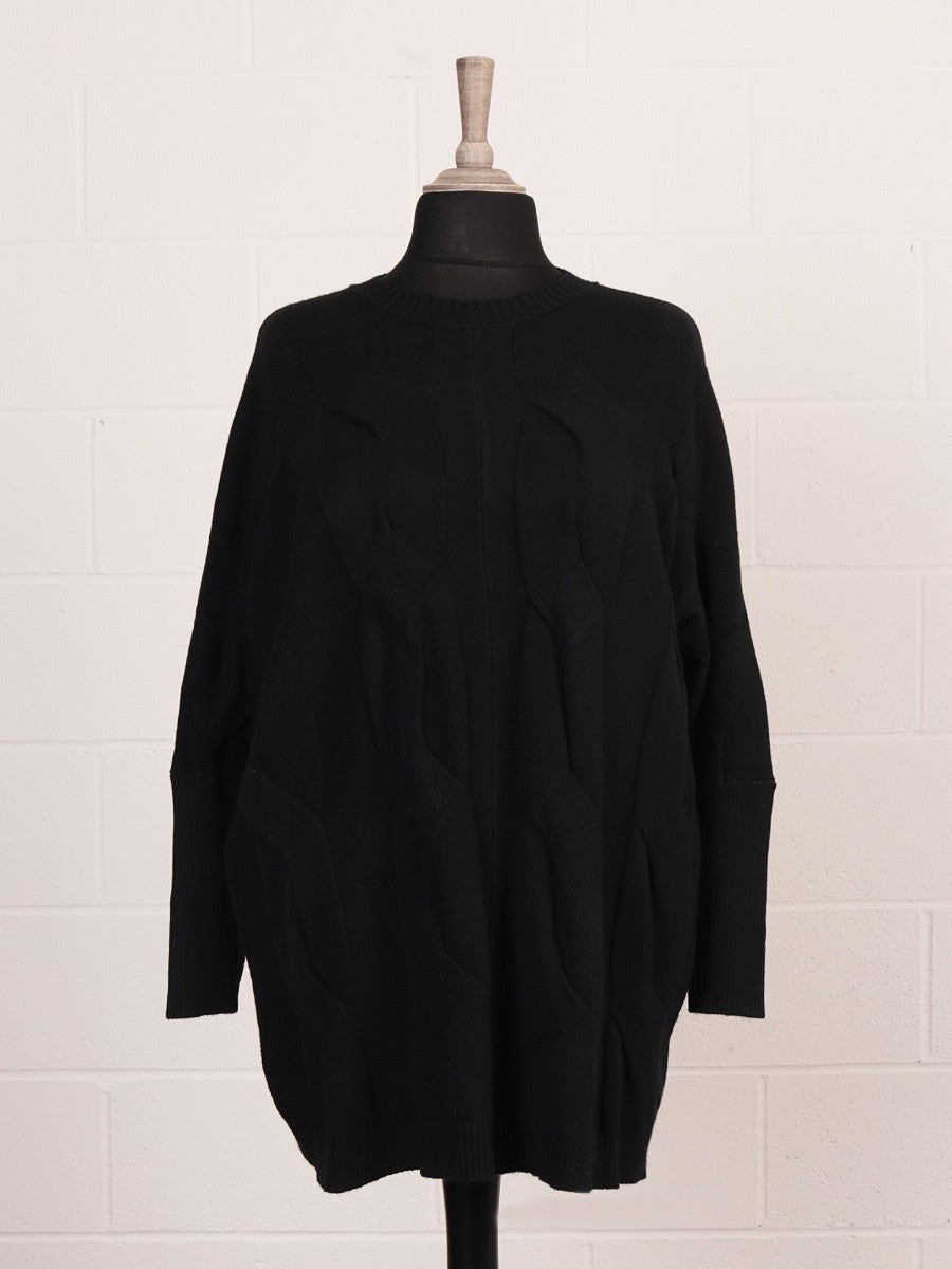 Crafted with fine Italian yarn, this black cable knitted batwing jumper combines traditional knitting techniques with a modern silhouette. The batwing sleeves offer a relaxed fit, enhancing comfort and ease of movement, while the intricate cable pattern adds texture and visual interest. Ideal for layering, this jumper provides warmth without bulk, making it a versatile addition to any expert wardrobe seeking both style and functionality.
