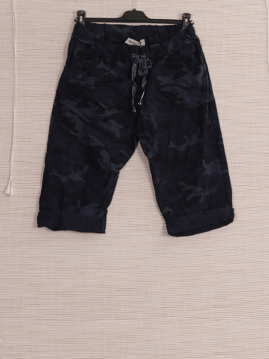 These Navy Italian Camouflage Print Knee Length Magic Shorts combine style and functionality with a distinctive camouflage design inspired by Italian aesthetics. Crafted for comfort and durability, their knee-length cut offers versatile wear for various activities. Ideal for those seeking a blend of fashion and practicality, these shorts provide a reliable fit and a unique look that stands out.