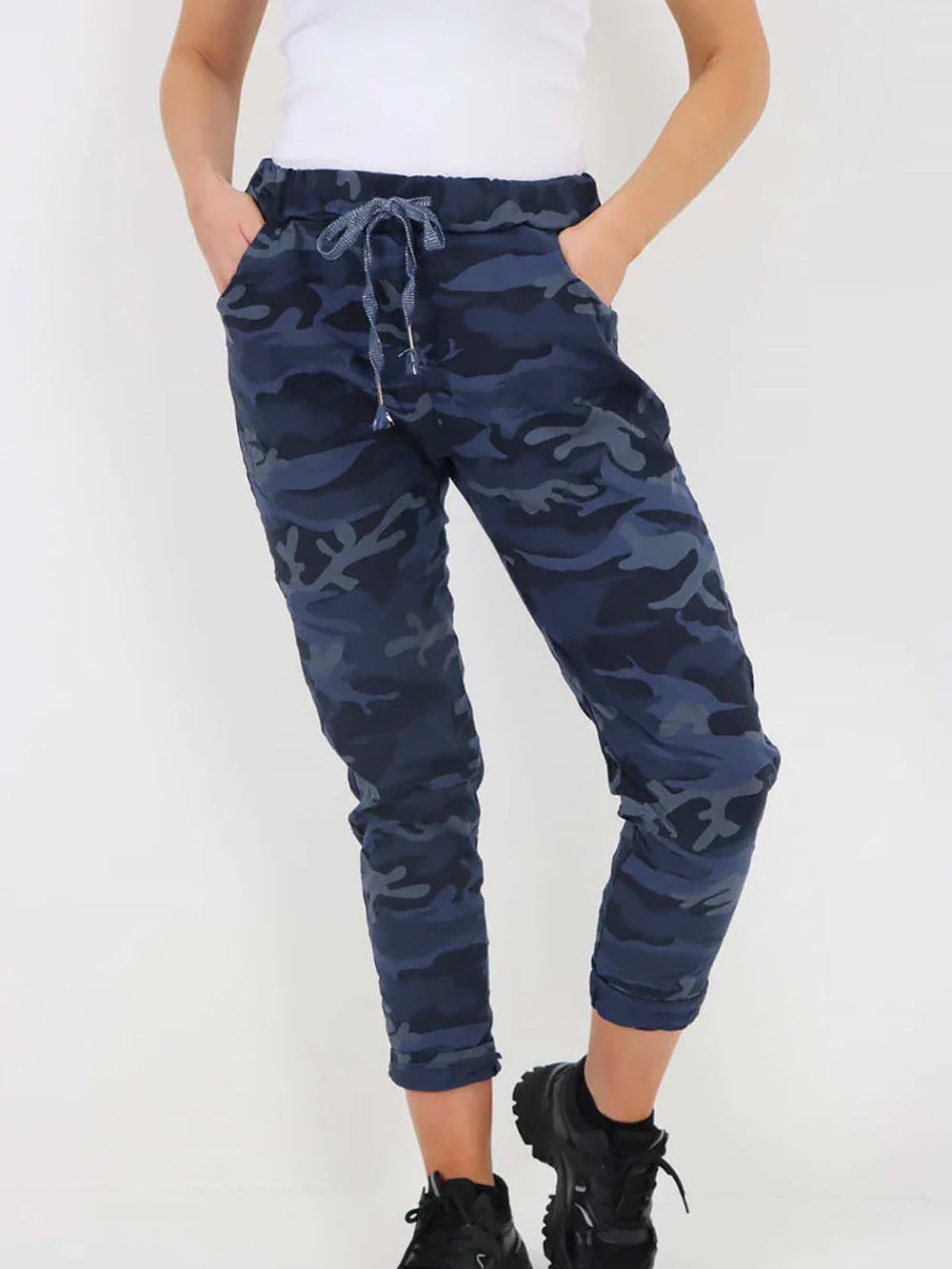 These Navy Italian Camouflage Print Magic Pants combine sophisticated design with versatile functionality. Crafted with premium materials, they offer a comfortable fit and durability suitable for various activities. The distinctive camouflage pattern adds a stylish edge, making them ideal for both casual wear and outdoor adventures. Expertly tailored, these pants provide flexibility and ease of movement without compromising on style. Perfect for those seeking a blend of fashion and practicality in their wardrobe.