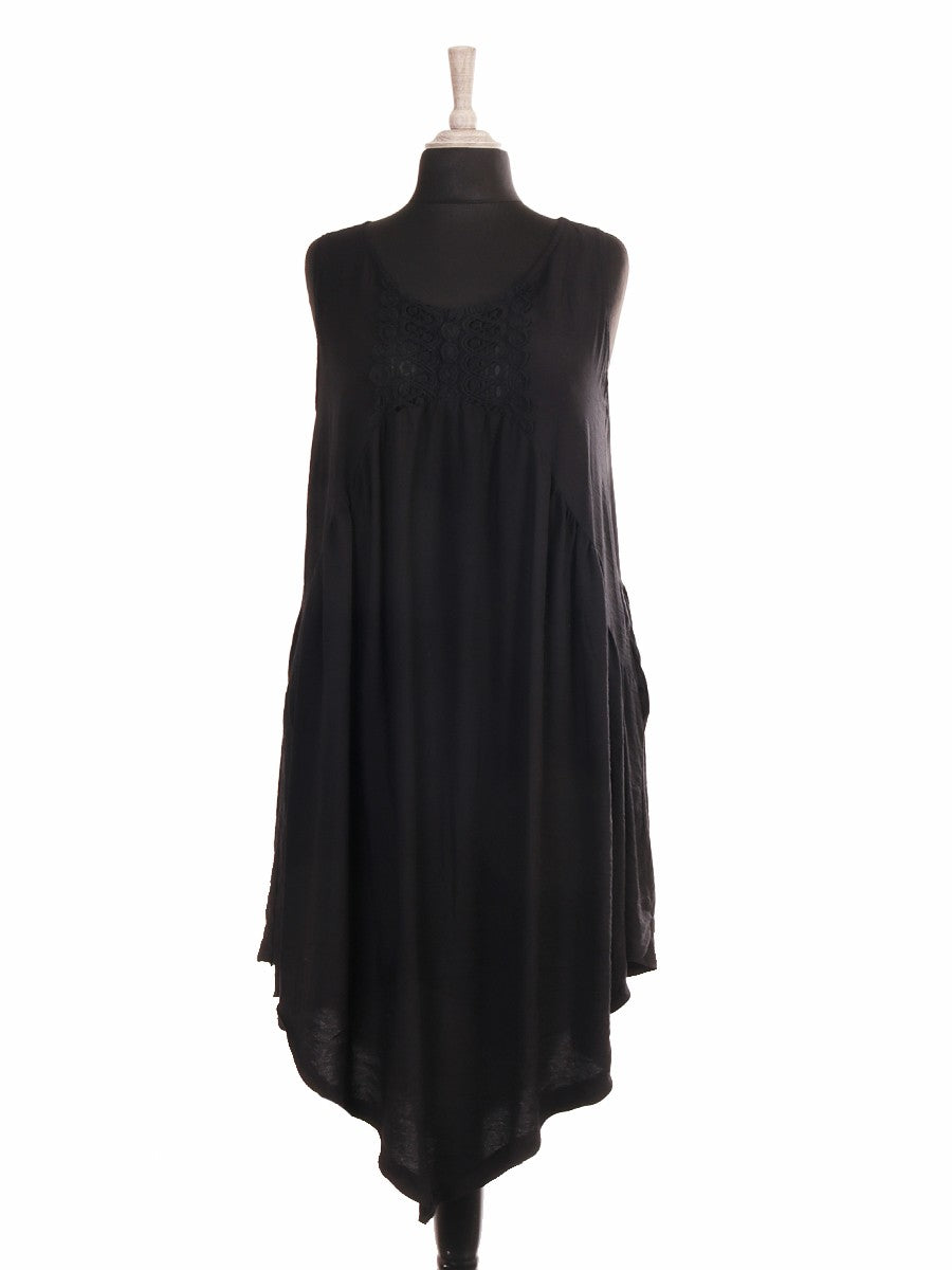 This black Italian Crochet Detail Handkerchief Hem Dress combines elegant craftsmanship with practical design. Featuring intricate crochet accents and a flowing handkerchief hem, it offers a sophisticated silhouette that moves gracefully. Thoughtfully designed pockets add convenience without compromising style, making this dress a refined choice for both casual and dressier occasions. Crafted to highlight quality and detail, it embodies timeless Italian-inspired fashion.