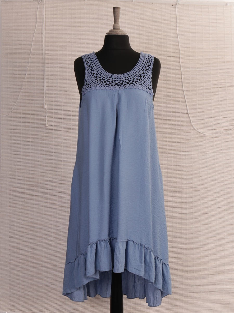 Elevate your wardrobe with this denim Italian Crochet Neck Dress, featuring delicate frilled hem detailing and a stylish dip hem silhouette. Crafted to combine classic crochet craftsmanship with modern design, it offers a refined yet contemporary look. The intricate neckline adds a touch of elegance, while the flowing dip hem enhances movement and visual interest, making it perfect for both casual and dressier occasions. This dress exemplifies sophisticated Italian design, ensuring you stand out with timeless style and expert tailoring.