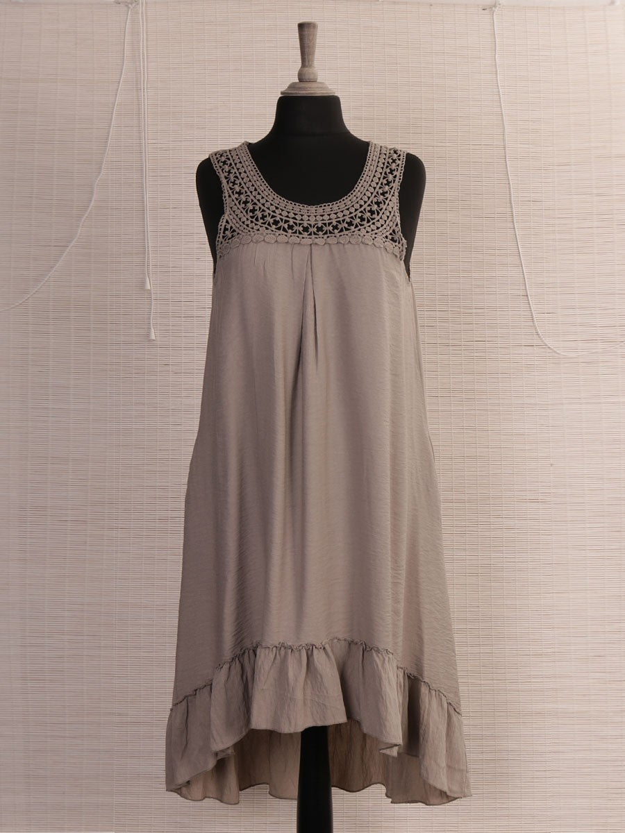 Elevate your wardrobe with this mocha Italian Crochet Neck Dress, featuring delicate frilled hem detailing and a stylish dip hem silhouette. Crafted to combine classic crochet craftsmanship with modern design, it offers a refined yet contemporary look. The intricate neckline adds a touch of elegance, while the flowing dip hem enhances movement and visual interest, making it perfect for both casual and dressier occasions. This dress exemplifies sophisticated Italian design, ensuring you stand out with timeless style and expert tailoring.