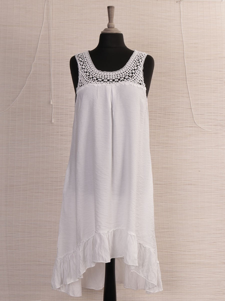 Elevate your wardrobe with this white Italian Crochet Neck Dress, featuring delicate frilled hem detailing and a stylish dip hem silhouette. Crafted to combine classic crochet craftsmanship with modern design, it offers a refined yet contemporary look. The intricate neckline adds a touch of elegance, while the flowing dip hem enhances movement and visual interest, making it perfect for both casual and dressier occasions. This dress exemplifies sophisticated Italian design, ensuring you stand out with timeless style and expert tailoring.