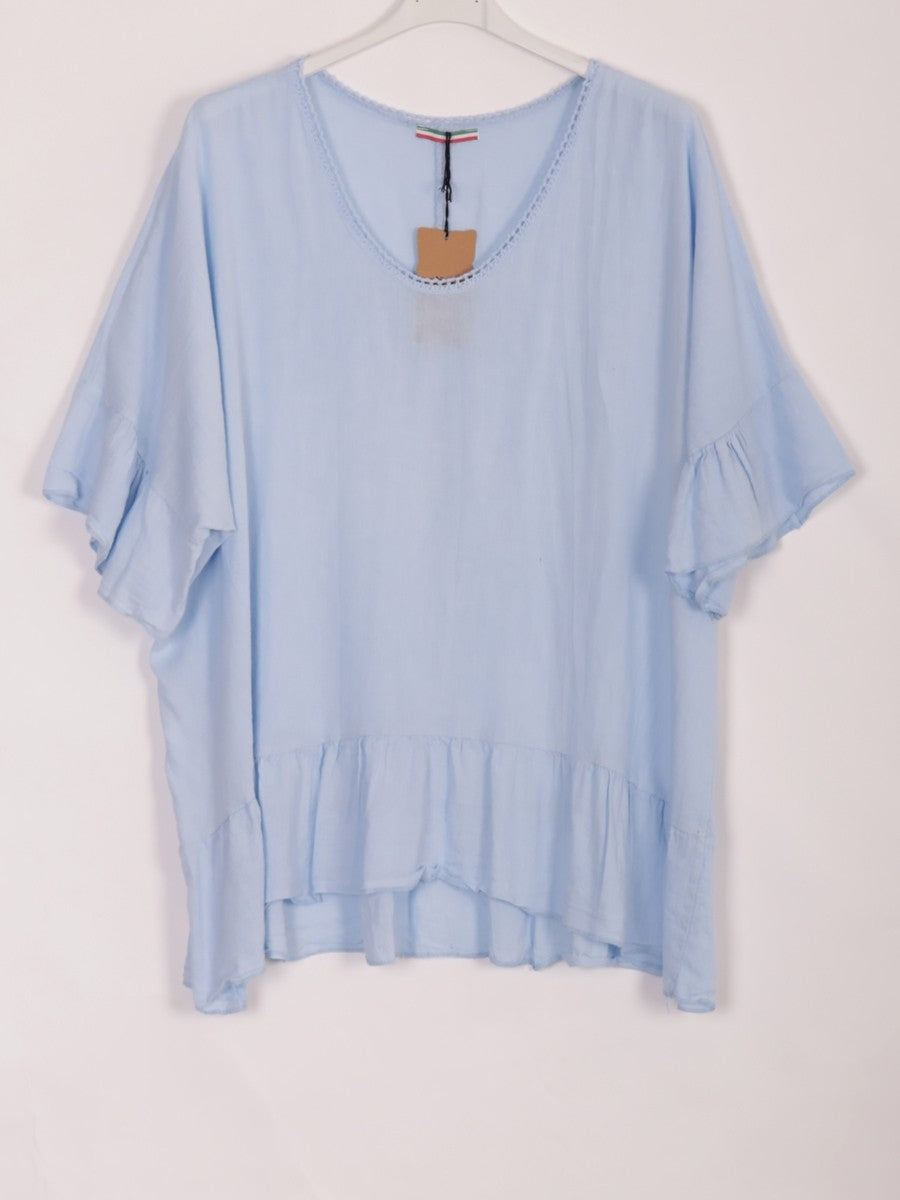 Experience refined comfort with the Ice Blue Italian Crochet Neck Linen Batwing Top. Crafted from breathable linen, this top features an elegant crochet neckline that adds a touch of artisanal detail. The batwing sleeves provide a relaxed fit, allowing ease of movement while maintaining a sophisticated silhouette. Ideal for warm weather, it combines natural fabric benefits with expert design for a timeless wardrobe staple.