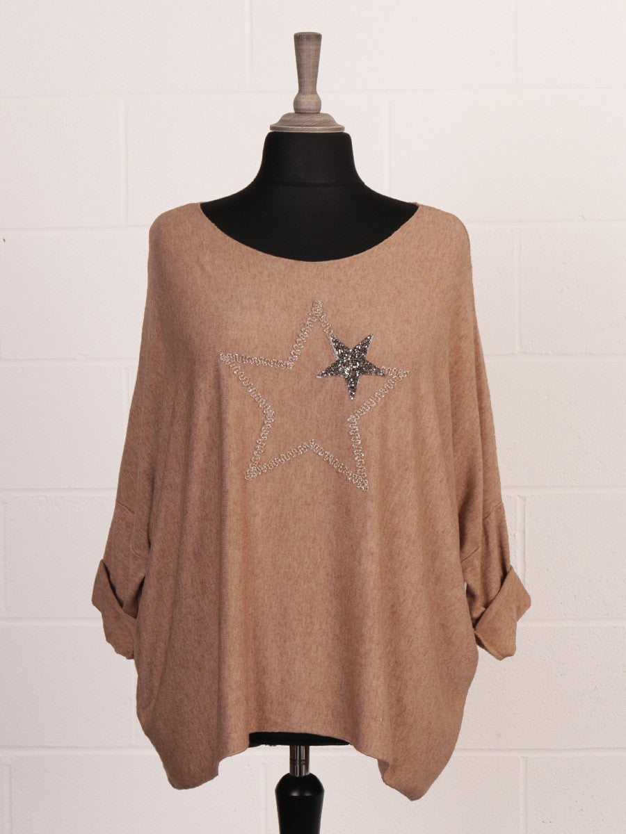 Elevate your wardrobe with this Camel Italian Diamante and Embroidered Star Detail Knitted Top. Crafted with fine Italian knitting techniques, it features intricate diamante embellishments and a distinctive embroidered star, combining luxury with contemporary style. Perfect for adding a refined yet playful touch to your outfit, this top offers both comfort and standout design for a sophisticated look.
