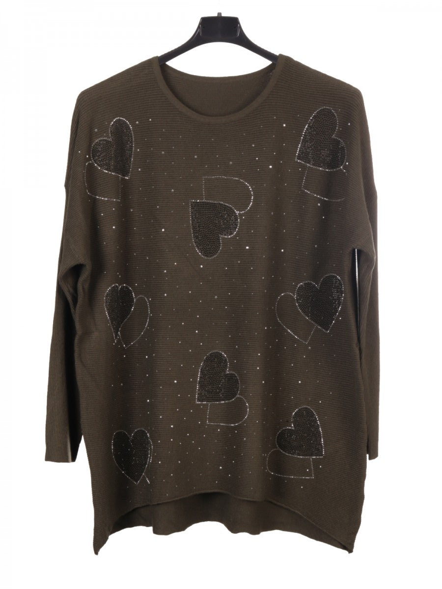 Elevate your knitwear collection with this Army Green Italian Diamante Heart Detail Ribbed Knitted Jumper. Crafted with fine ribbed knitting, it offers a flattering fit and comfortable stretch. The subtle diamante heart embellishment adds a refined touch of elegance, making it perfect for both casual and dressier occasions. This jumper combines quality Italian craftsmanship with timeless style, ensuring durability and a sophisticated look season after season.