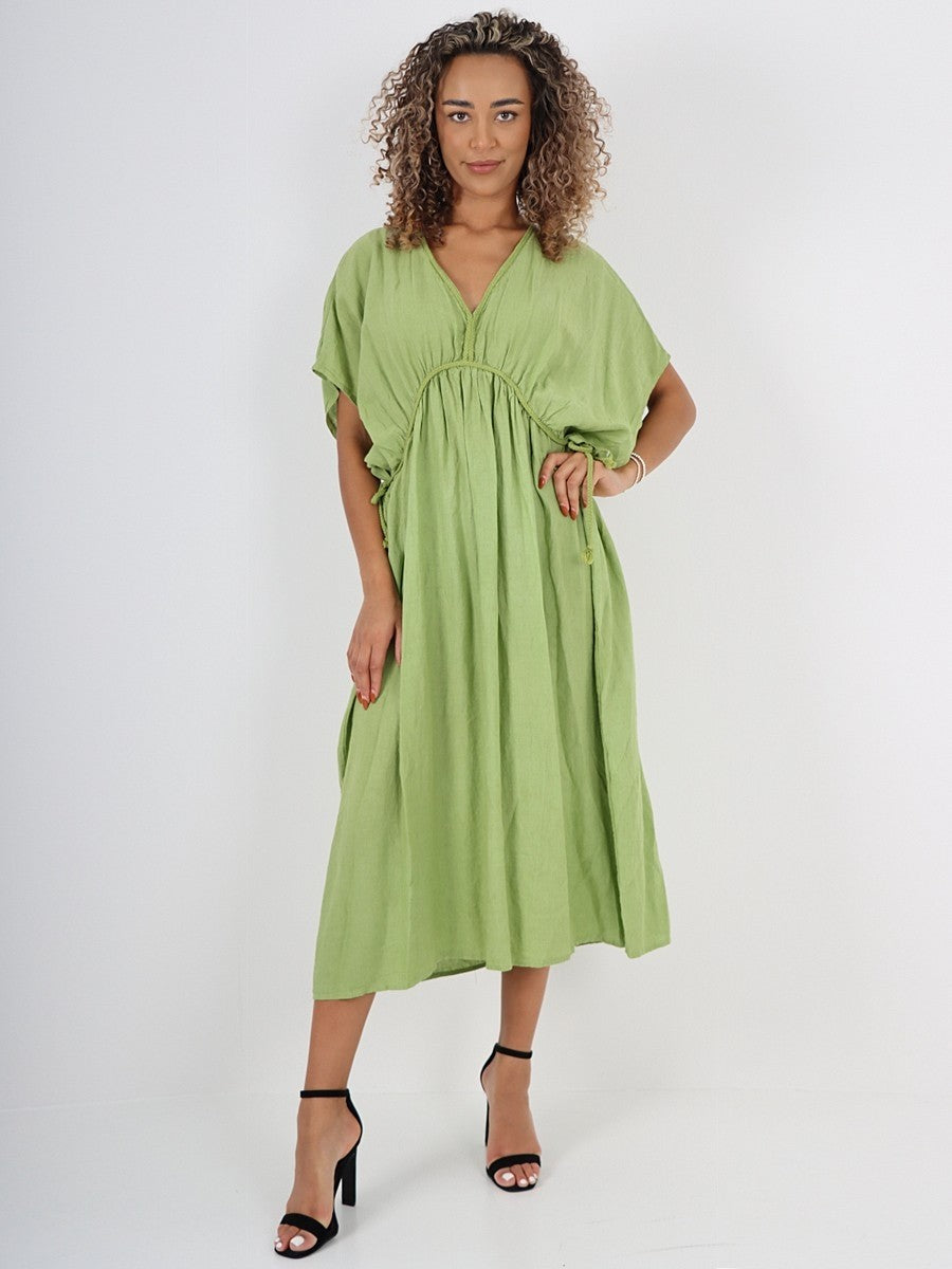 Crafted from breathable line, this lime green Italian Drawstring Flared Dress combines comfort with refined style. The adjustable drawstring waist ensures a tailored fit, while the flared silhouette offers graceful movement. Ideal for warm weather, its natural fabric promotes airflow, making it a sophisticated choice for both casual and elegant occasions.
