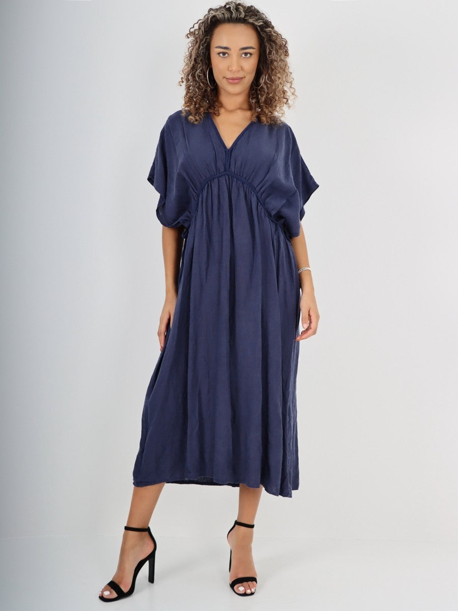 Crafted from breathable line, this navy Italian Drawstring Flared Dress combines comfort with refined style. The adjustable drawstring waist ensures a tailored fit, while the flared silhouette offers graceful movement. Ideal for warm weather, its natural fabric promotes airflow, making it a sophisticated choice for both casual and elegant occasions.