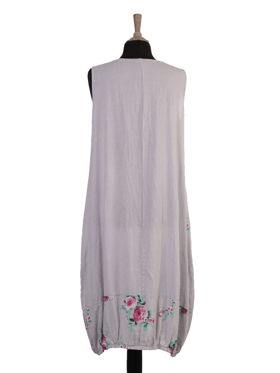 This light grey Italian linen dress features a relaxed lagenlook silhouette with a delicate floral pattern and an elasticated hem for a comfortable, flattering fit. Crafted from breathable linen, it offers natural comfort and effortless style, ideal for warm weather or layered looks. The elasticated hem adds subtle shape while maintaining ease of movement, making it a versatile addition to any wardrobe.