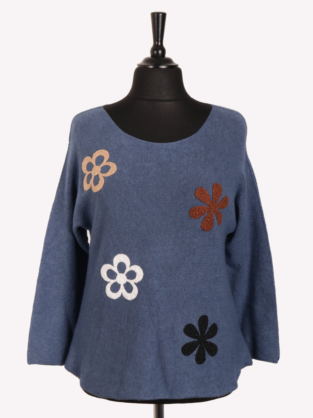 Crafted from premium Italian yarn, this soft knit jumper features delicate embossed floral detailing that adds sophisticated texture and visual interest. The luxurious fabric drapes beautifully whilst maintaining its shape, offering both comfort and refined elegance. Perfect for layering or wearing as a standalone piece, the denim hue brings a fresh, contemporary edge to your wardrobe. Ideal for those who appreciate quality craftsmanship and understated design details.