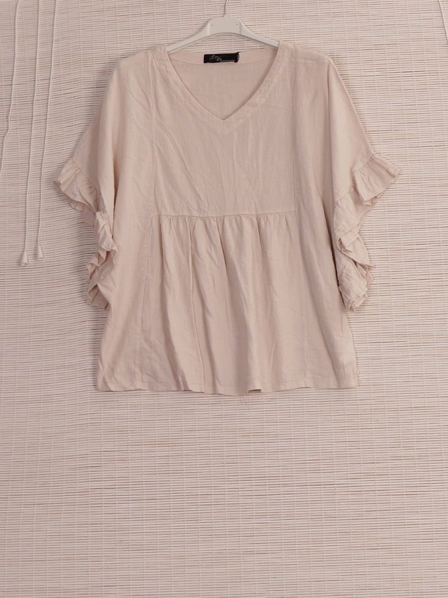Elevate your wardrobe with the Beige Italian Frilled Sleeves Linen Batwing Top, expertly crafted from breathable linen for all-day comfort. Its batwing silhouette offers a relaxed yet sophisticated fit, while the delicate frilled sleeves add a refined, feminine touch. Perfect for both casual and elegant occasions, this top combines Italian design finesse with versatile wearability.
