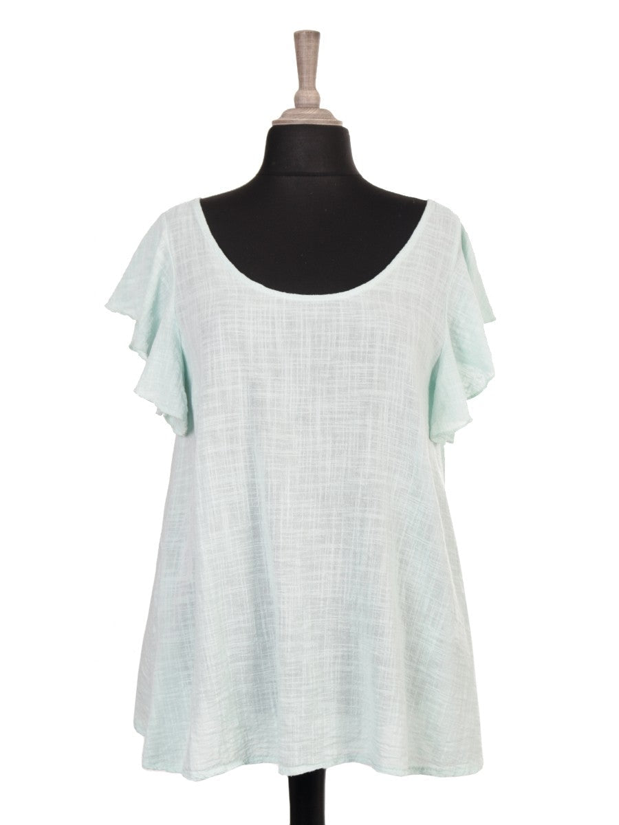 This Italian-inspired aqua top features delicate frilled sleeves and a smocked back for a comfortable, tailored fit. Its flared silhouette adds a graceful movement, making it an elegant choice for both casual and refined occasions. Crafted to combine style with ease, this top enhances your wardrobe with a touch of sophisticated charm.