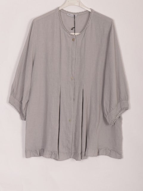 Elevate your wardrobe with this light grey Italian Lace Detail Button Through Linen Top, expertly crafted for a refined yet breathable look. The delicate lace accents add a touch of sophistication, while the button-through design offers versatile styling options. Made from high-quality linen, this top ensures comfort and durability, perfect for both casual and elegant occasions. Its tailored fit enhances your silhouette, making it a timeless addition to your collection.