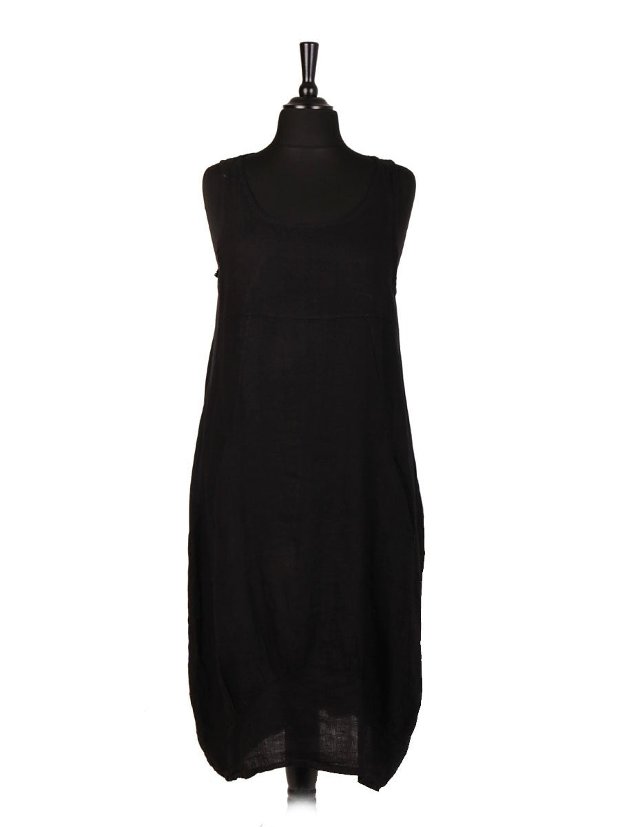 Crafted from premium Italian linen, this black Lagenlook dress features a distinctive side ribbed panel that enhances its relaxed silhouette. Designed for comfort and style, it offers breathable fabric ideal for warm weather while the ribbed detail adds subtle texture and visual interest. Perfect for those seeking an effortlessly elegant yet contemporary look.