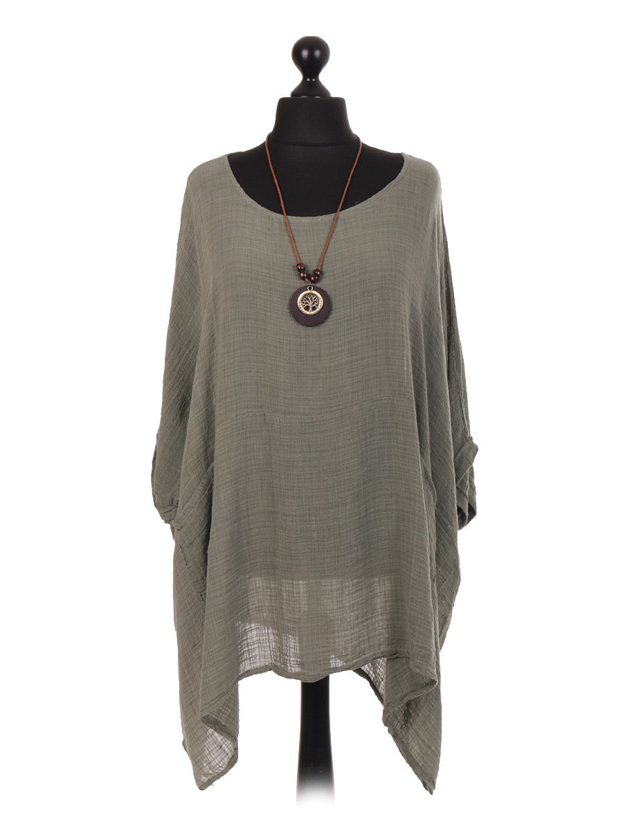This khaki Italian plain batwing top in khaki combines effortless style with practical design. Crafted for a relaxed fit, its batwing sleeves offer comfort and freedom of movement. The front pockets add a functional touch, while the included necklace enhances the overall look with subtle elegance. Ideal for both casual and refined occasions, this top delivers versatility and timeless appeal.