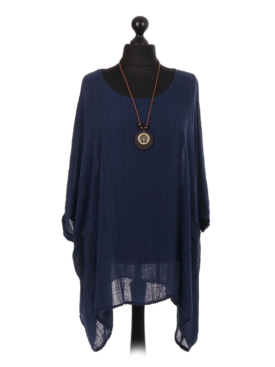 This navy Italian plain batwing top in navy combines effortless style with practical design. Crafted for a relaxed fit, its batwing sleeves offer comfort and freedom of movement. The front pockets add a functional touch, while the included necklace enhances the overall look with subtle elegance. Ideal for both casual and refined occasions, this top delivers versatility and timeless appeal.