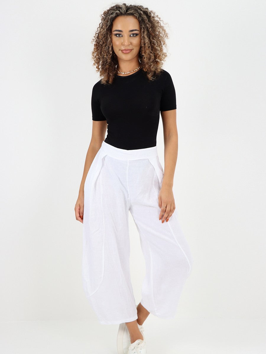 Crafted from premium Italian linen, these White plain layered pants offer exceptional breathability and a refined silhouette. The layered design adds subtle depth and texture, making them versatile for both casual and sophisticated looks. Ideal for warm weather, they combine comfort with expert tailoring to elevate your wardrobe essentials.