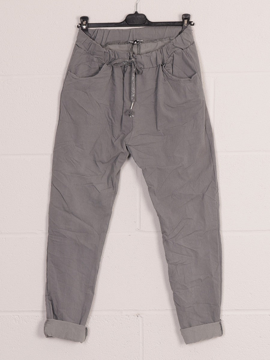 Experience the perfect blend of style and functionality with these Grey Italian Plain Magic Pants. Crafted for a sleek, tailored look, they feature convenient side pockets for practicality without compromising elegance. Ideal for both professional and casual settings, these pants offer comfort and versatility, making them a smart addition to any wardrobe.