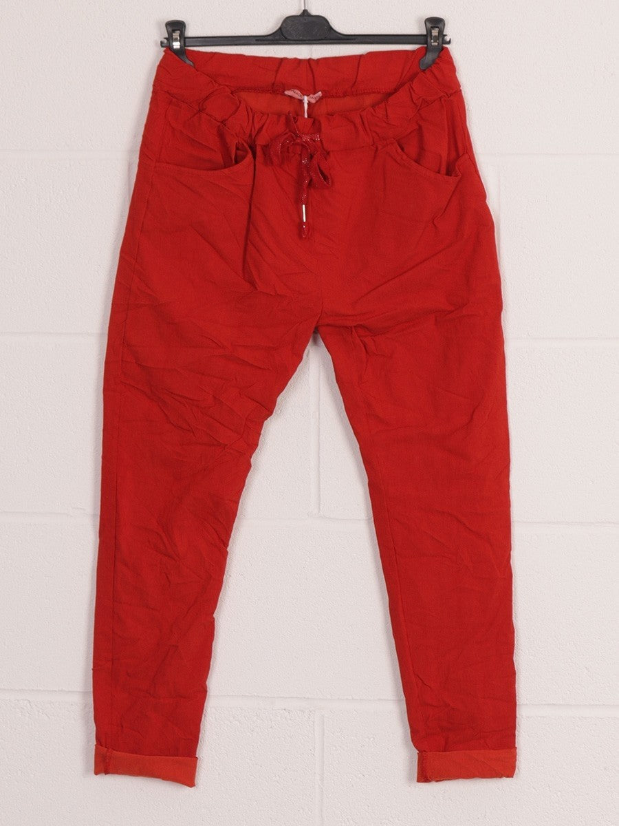 Experience the perfect blend of style and functionality with these Red Italian Plain Magic Pants. Crafted for a sleek, tailored look, they feature convenient side pockets for practicality without compromising elegance. Ideal for both professional and casual settings, these pants offer comfort and versatility, making them a smart addition to any wardrobe.