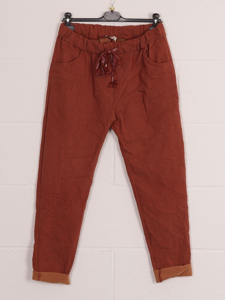 Experience the perfect blend of style and functionality with these Rust Italian Plain Magic Pants. Crafted for a sleek, tailored look, they feature convenient side pockets for practicality without compromising elegance. Ideal for both professional and casual settings, these pants offer comfort and versatility, making them a smart addition to any wardrobe.