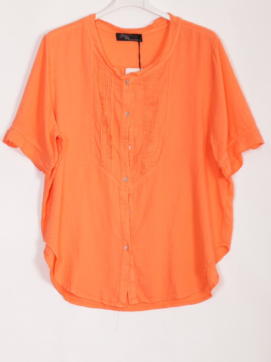 Crafted from breathable linen, this orange Italian pleated front blouse combines timeless elegance with expert tailoring. The delicate pleats enhance its refined silhouette, while the button-through design offers versatile styling options. Ideal for warm weather, it delivers both comfort and sophistication for a polished, professional look.