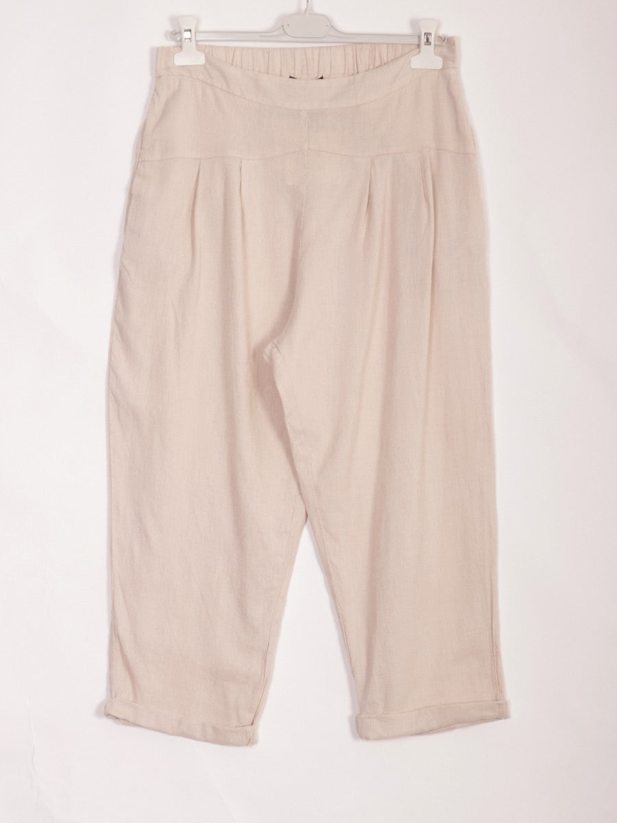 Crafted from premium linen, these beige Italian pleated trousers offer a relaxed fit that ensures comfort and effortless style. The pleated design adds a refined touch, while the denim hue provides versatile wearability. Ideal for warm weather, they combine breathability with a sophisticated silhouette, perfect for both casual and smart occasions