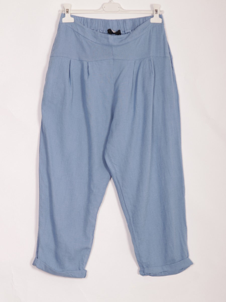 Crafted from premium linen, these denim Italian pleated trousers offer a relaxed fit that ensures comfort and effortless style. The pleated design adds a refined touch, while the denim hue provides versatile wearability. Ideal for warm weather, they combine breathability with a sophisticated silhouette, perfect for both casual and smart occasions
