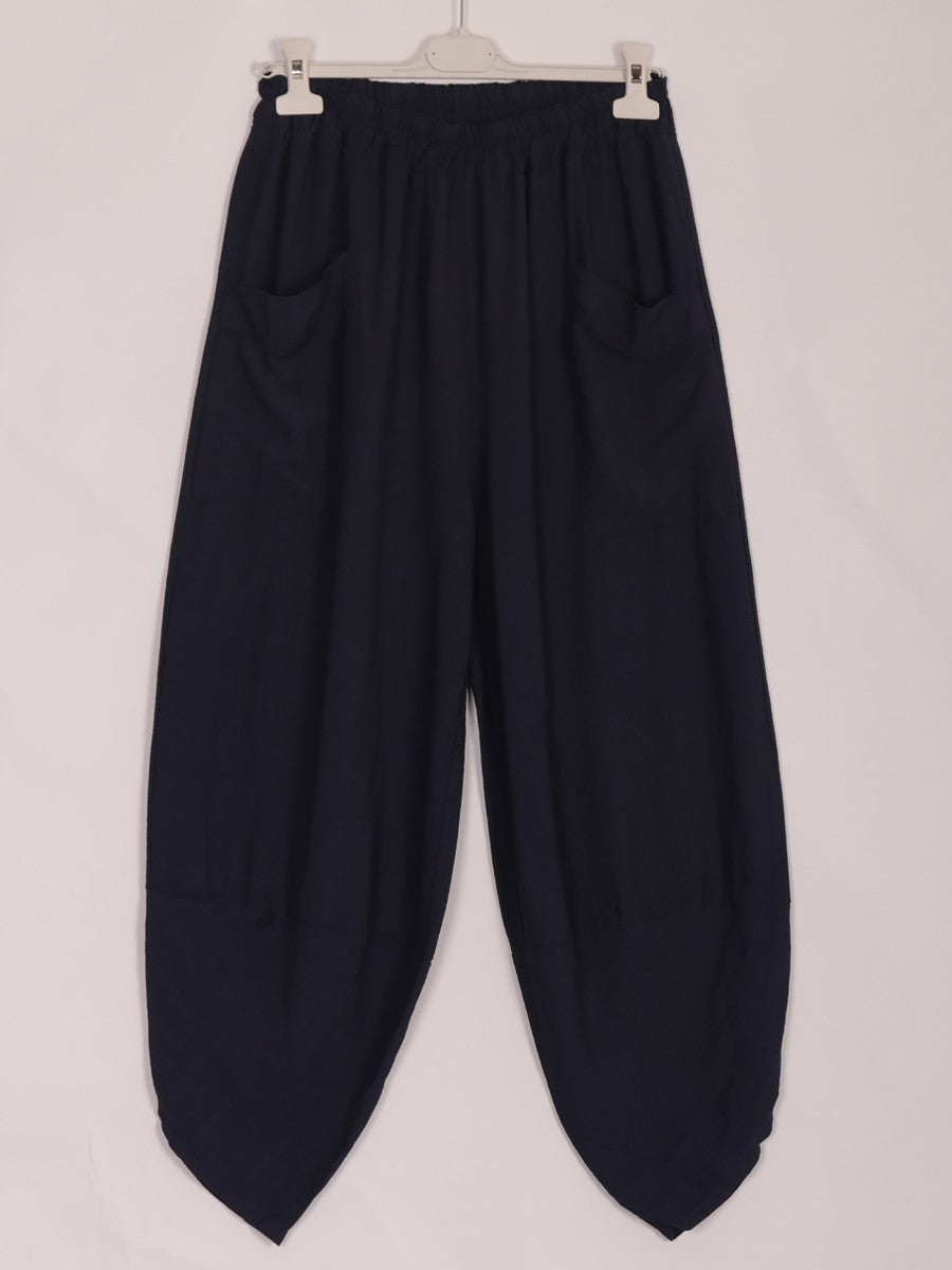 These Navy Italian Relaxed Fit Harem Trousers combine comfort with sophisticated style. Designed with a relaxed silhouette and practical front pockets, they offer ease of movement and convenient storage. Crafted to provide a modern yet timeless look, these trousers are ideal for those seeking both functionality and elegance in their wardrobe.