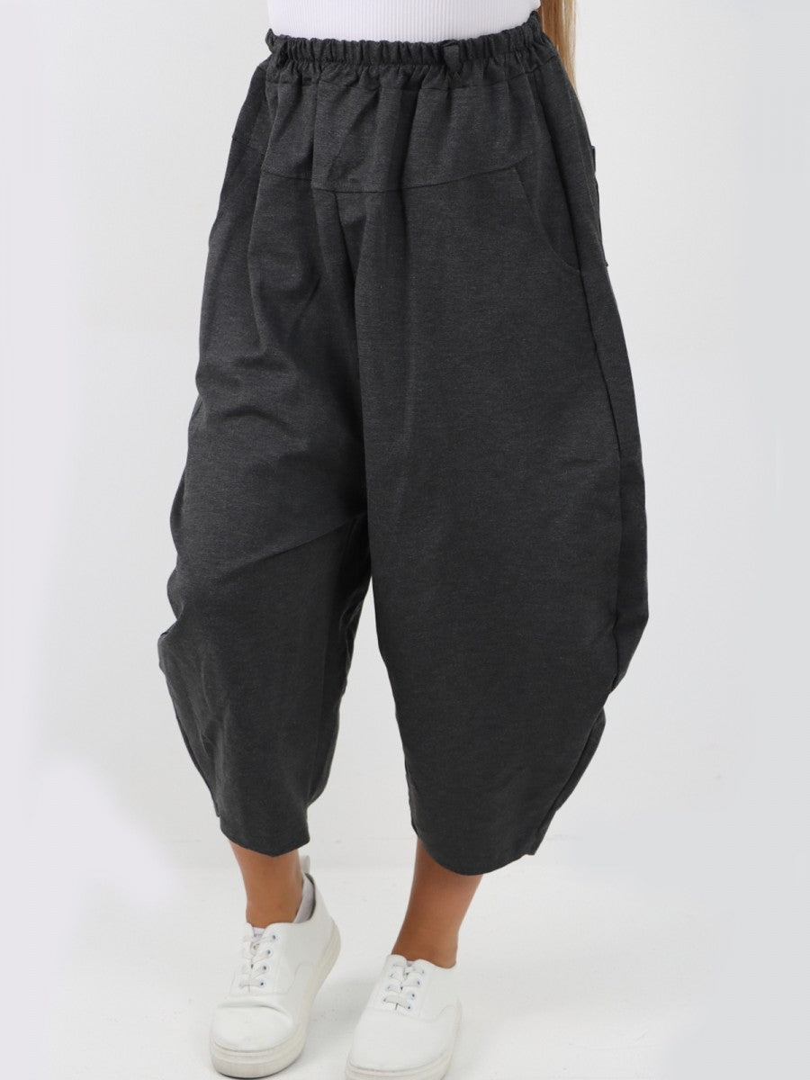 These Charcoal Italian Relaxed Fit Scuba Cocoon Style Trousers in black combine contemporary design with comfort. Crafted from scuba fabric, they offer a smooth texture and subtle stretch, ensuring ease of movement. The cocoon silhouette provides a modern, relaxed fit that drapes elegantly, making them suitable for both casual and refined looks.