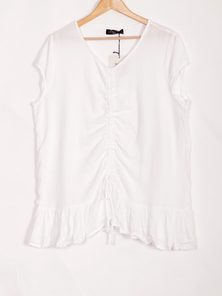 Crafted from breathable linen, this white Italian Ruched Front Linen Top combines timeless elegance with expert tailoring. The ruched front detail enhances the silhouette, offering a flattering fit that complements various body types. Ideal for warm weather, its lightweight fabric ensures comfort while maintaining a polished look suitable for both casual and refined occasions.
