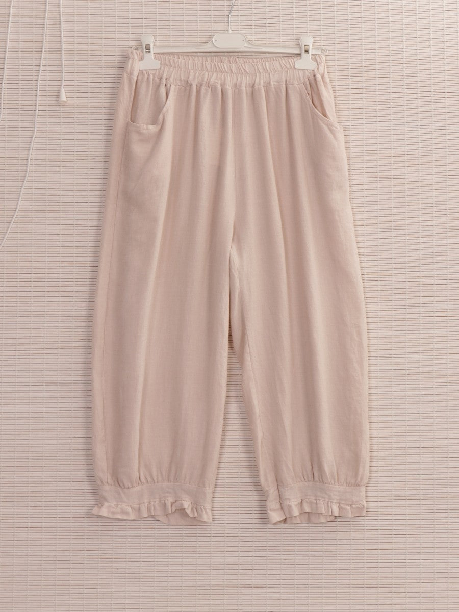 These Italian ruffled hem linen trousers in beige combine relaxed comfort with refined style. Crafted from breathable linen, they offer a lightweight feel ideal for warmer days. The ruffled hem adds a subtle, elegant detail that elevates the classic relaxed fit, making them versatile for both casual and polished looks. Perfect for those seeking effortless sophistication with a touch of Italian flair.