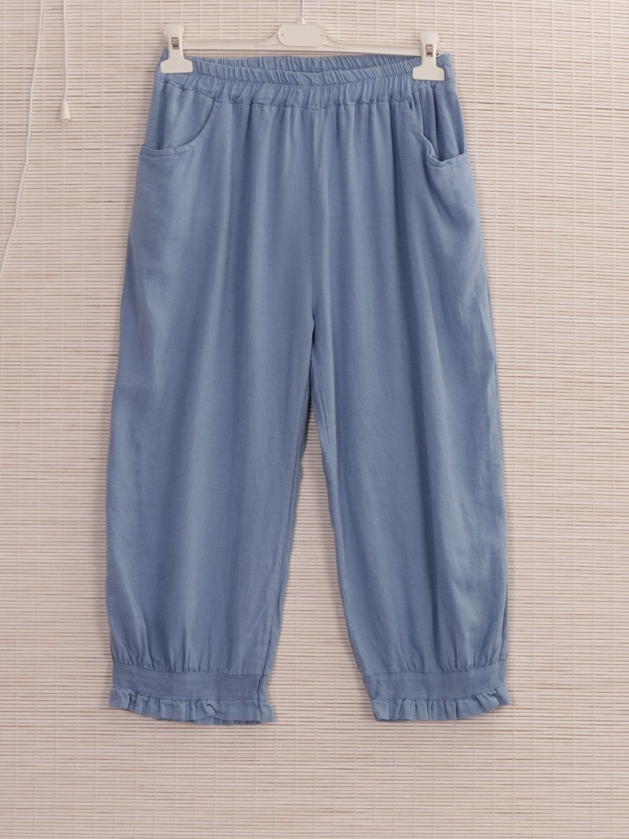 These Italian ruffled hem linen trousers in light denim combine relaxed comfort with refined style. Crafted from breathable linen, they offer a lightweight feel ideal for warmer days. The ruffled hem adds a subtle, elegant detail that elevates the classic relaxed fit, making them versatile for both casual and polished looks. Perfect for those seeking effortless sophistication with a touch of Italian flair.