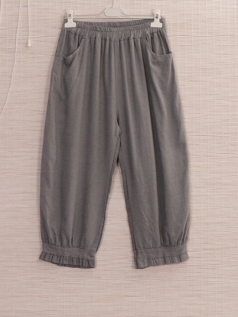 These Italian ruffled hem linen trousers in Grey combine relaxed comfort with refined style. Crafted from breathable linen, they offer a lightweight feel ideal for warmer days. The ruffled hem adds a subtle, elegant detail that elevates the classic relaxed fit, making them versatile for both casual and polished looks. Perfect for those seeking effortless sophistication with a touch of Italian flair.