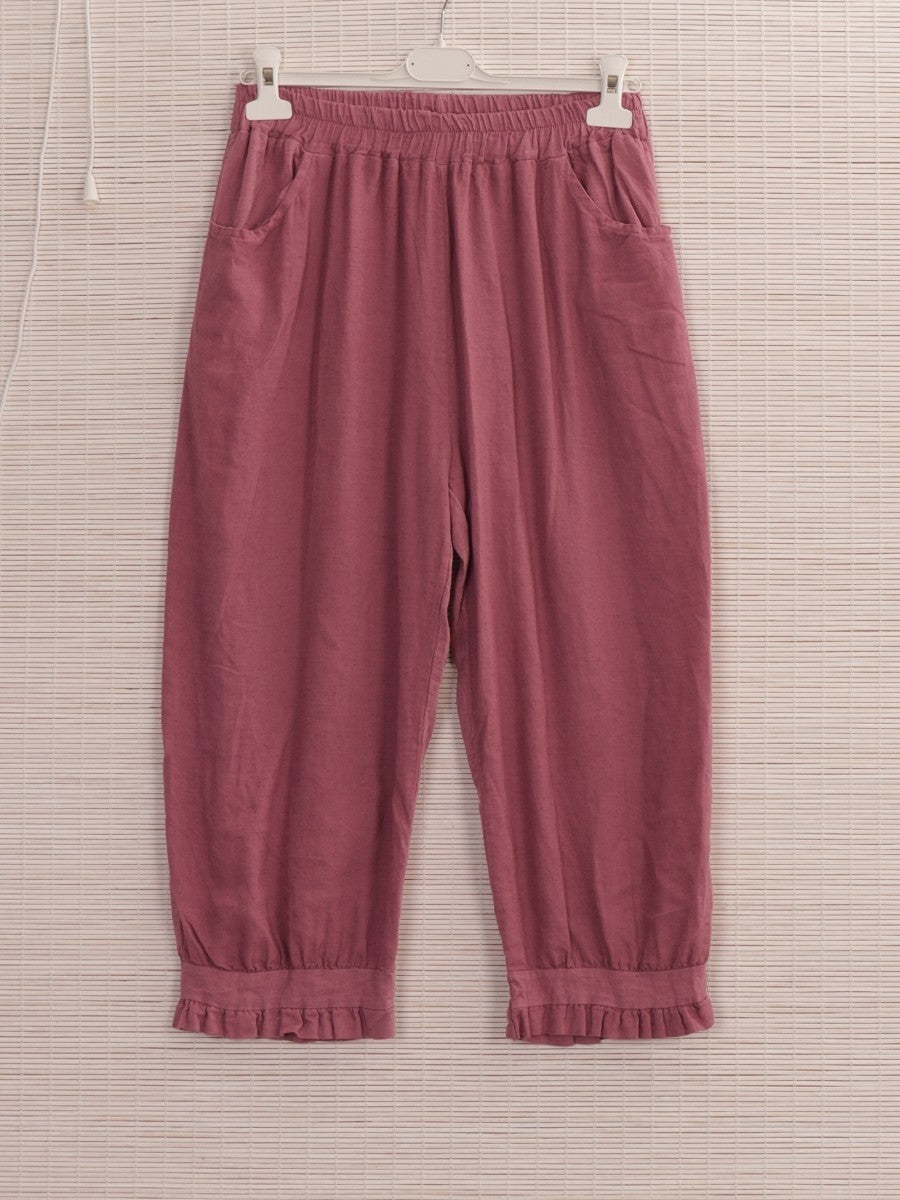 These Italian ruffled hem linen trousers in Tea Pink combine relaxed comfort with refined style. Crafted from breathable linen, they offer a lightweight feel ideal for warmer days. The ruffled hem adds a subtle, elegant detail that elevates the classic relaxed fit, making them versatile for both casual and polished looks. Perfect for those seeking effortless sophistication with a touch of Italian flair.