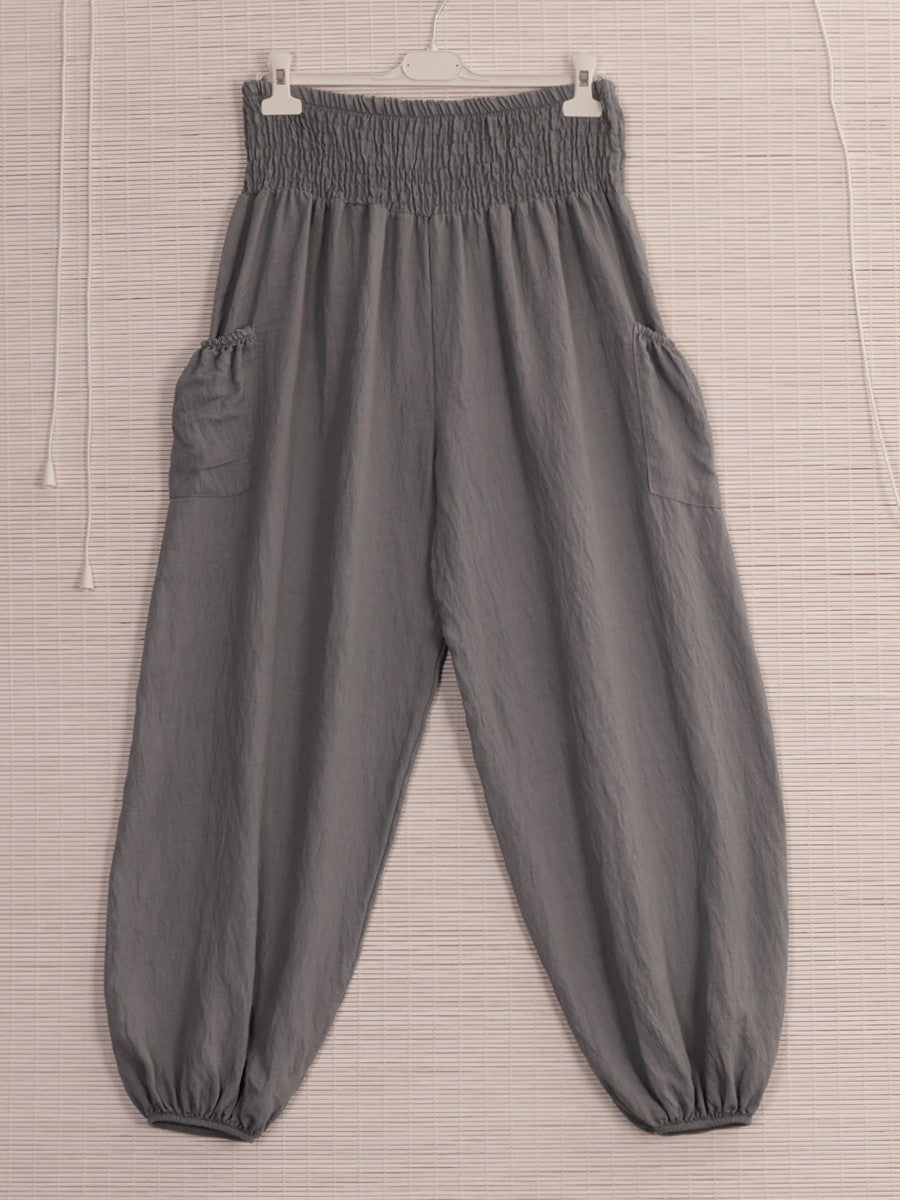 These Italian Side Pockets Detail Harem Pants in grey combine traditional comfort with modern style. Crafted for a relaxed fit, they feature practical side pockets that add functionality without compromising the sleek silhouette. Ideal for both casual and refined looks, these pants offer versatility and ease, making them a sophisticated addition to any wardrobe.