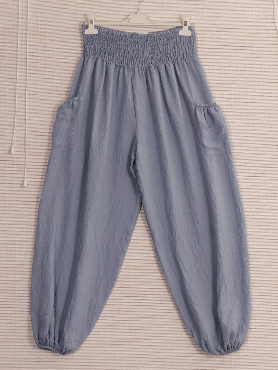 These Italian Side Pockets Detail Harem Pants in light denimcombine traditional comfort with modern style. Crafted for a relaxed fit, they feature practical side pockets that add functionality without compromising the sleek silhouette. Ideal for both casual and refined looks, these pants offer versatility and ease, making them a sophisticated addition to any wardrobe.
