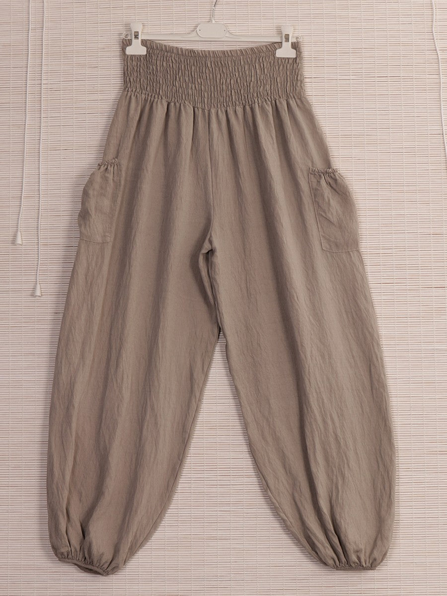 These Italian Side Pockets Detail Harem Pants in mocha combine traditional comfort with modern style. Crafted for a relaxed fit, they feature practical side pockets that add functionality without compromising the sleek silhouette. Ideal for both casual and refined looks, these pants offer versatility and ease, making them a sophisticated addition to any wardrobe.