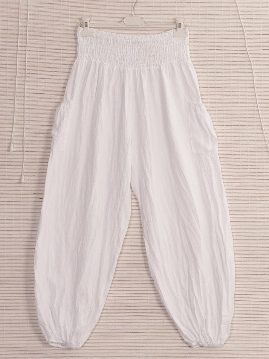 These Italian Side Pockets Detail Harem Pants in white combine traditional comfort with modern style. Crafted for a relaxed fit, they feature practical side pockets that add functionality without compromising the sleek silhouette. Ideal for both casual and refined looks, these pants offer versatility and ease, making them a sophisticated addition to any wardrobe.