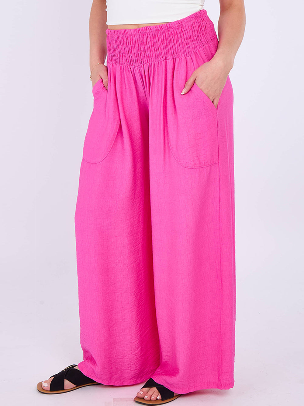 Wholesale Italian smocked elasticated waist palazzo trousers in cerise combine comfort with elegance. Crafted for a relaxed yet refined fit, the elasticated smocked waistband ensures flexibility and ease of wear, while the plain design offers versatile styling options. The flowing palazzo cut enhances movement and breathability, making these trousers ideal for both casual and sophisticated occasions.