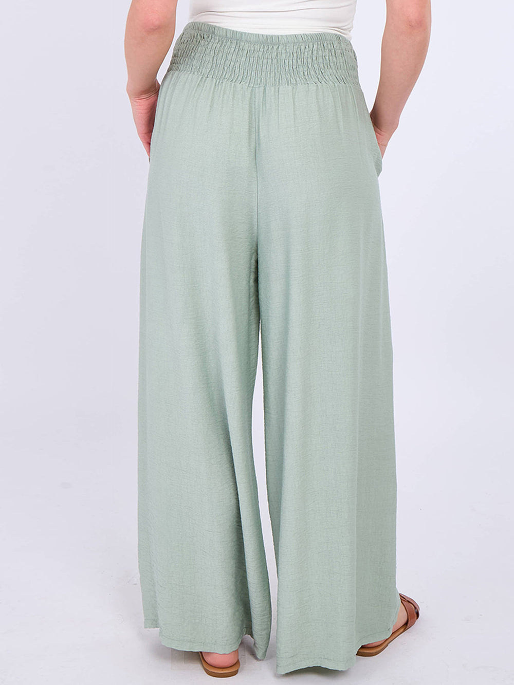 Wholesale Italian smocked elasticated waist palazzo trousers in khaki combine comfort with elegance. Crafted for a relaxed yet refined fit, the elasticated smocked waistband ensures flexibility and ease of wear, while the plain design offers versatile styling options. The flowing palazzo cut enhances movement and breathability, making these trousers ideal for both casual and sophisticated occasions.