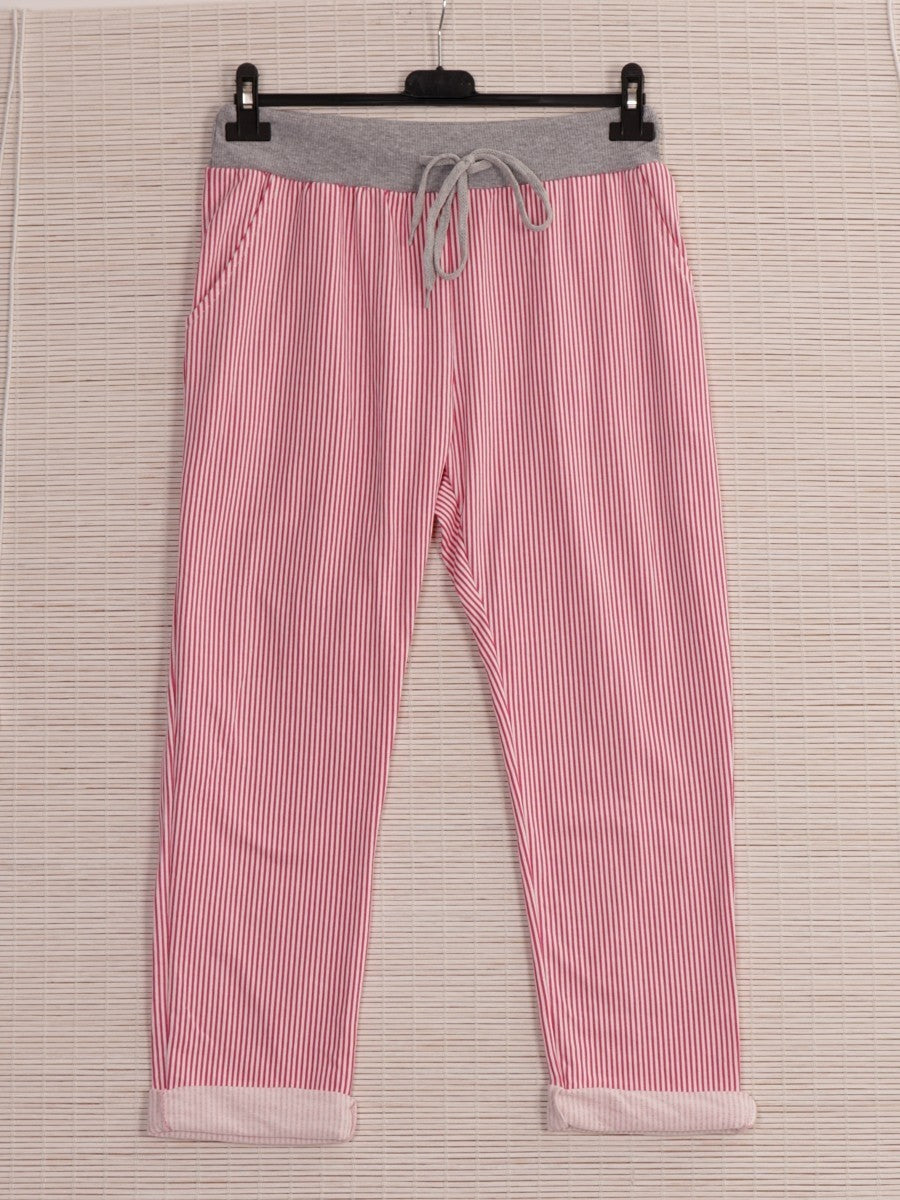 Crafted from breathable cotton, these cerise Italian striped print trousers combine classic style with exceptional comfort. The refined vertical stripes elongate the silhouette, making them ideal for both casual and smart occasions. Expertly tailored for a flattering fit, they offer versatility and timeless appeal in your wardrobe.