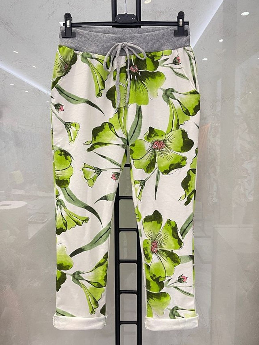 Experience comfort and style with these Parrot Green Italian Tulip Printed Cotton Joggers. Crafted from soft, breathable cotton, they offer a relaxed fit ideal for everyday wear. The elegant tulip print adds a touch of sophistication, making them perfect for casual outings or lounging at home. Durable and easy to care for, these joggers combine fashion with functionality for a versatile wardrobe staple.