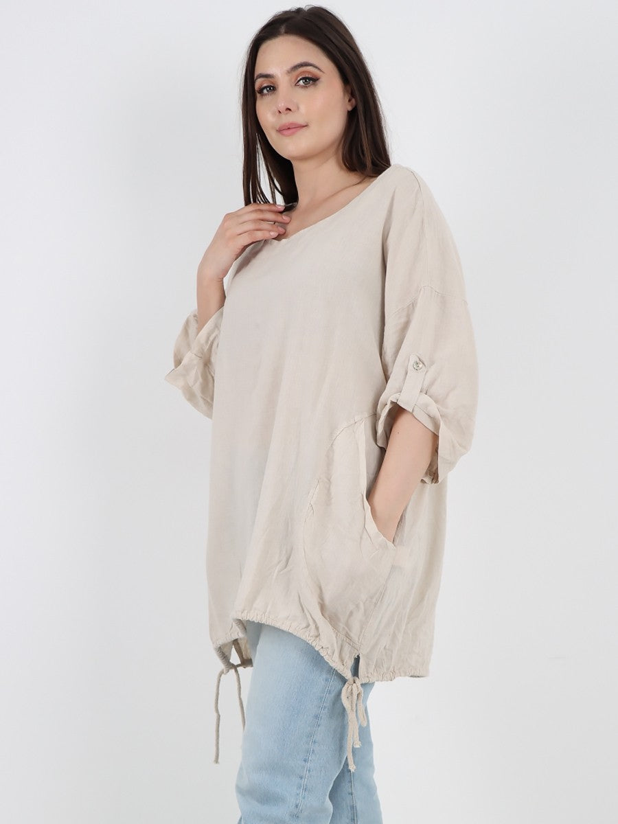 This beige Italian linen top features stylish turn-up sleeves and a gathered hem, combining classic craftsmanship with contemporary design. Its breathable fabric ensures comfort and durability, making it an ideal choice for sophisticated, everyday wear. The tailored details enhance fit and silhouette, reflecting expert attention to quality and style.