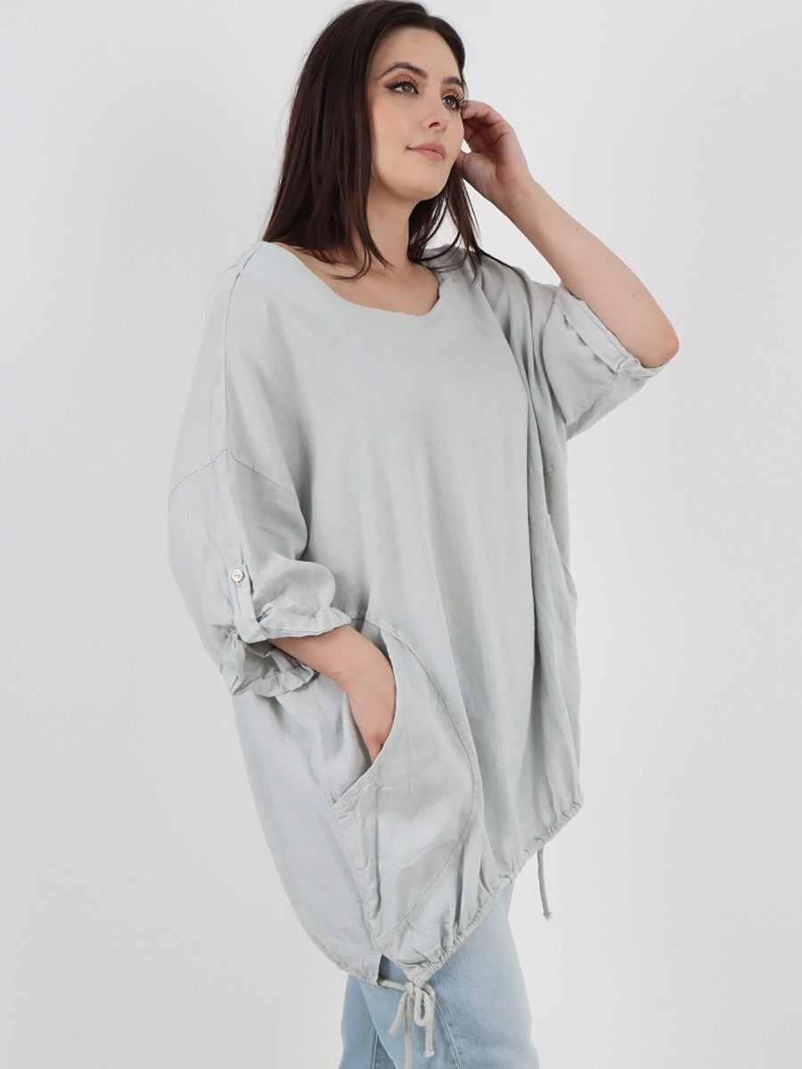 This light grey Italian linen top features stylish turn-up sleeves and a gathered hem, combining classic craftsmanship with contemporary design. Its breathable fabric ensures comfort and durability, making it an ideal choice for sophisticated, everyday wear. The tailored details enhance fit and silhouette, reflecting expert attention to quality and style.
