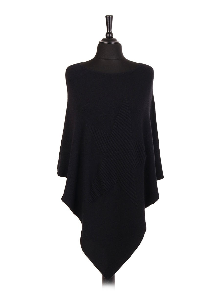 Crafted from a premium Italian wool blend, this black ribbed star poncho offers exceptional warmth and refined texture. Its structured ribbing enhances durability while providing a flattering silhouette. Ideal for layering, it combines timeless style with expert craftsmanship, making it a versatile addition to any sophisticated wardrobe.