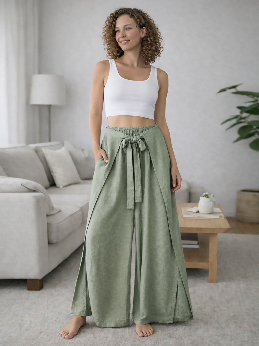 Crafted from premium Italian fabric, these wide-leg khaki trousers combine contemporary design with refined elegance. The wrap front creates a flattering silhouette whilst the split hem adds modern movement to the legs. An adjustable tie waist ensures a customised fit for all body types. Perfect for elevating both professional and casual wardrobes, these trousers deliver sophisticated style with effortless versatility.