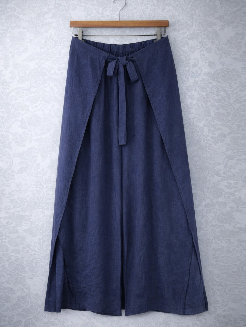 Crafted from premium Italian fabric, these wide-leg navy trousers combine contemporary design with refined elegance. The wrap front creates a flattering silhouette whilst the split hem adds modern movement to the legs. An adjustable tie waist ensures a customised fit for all body types. Perfect for elevating both professional and casual wardrobes, these trousers deliver sophisticated style with effortless versatility.