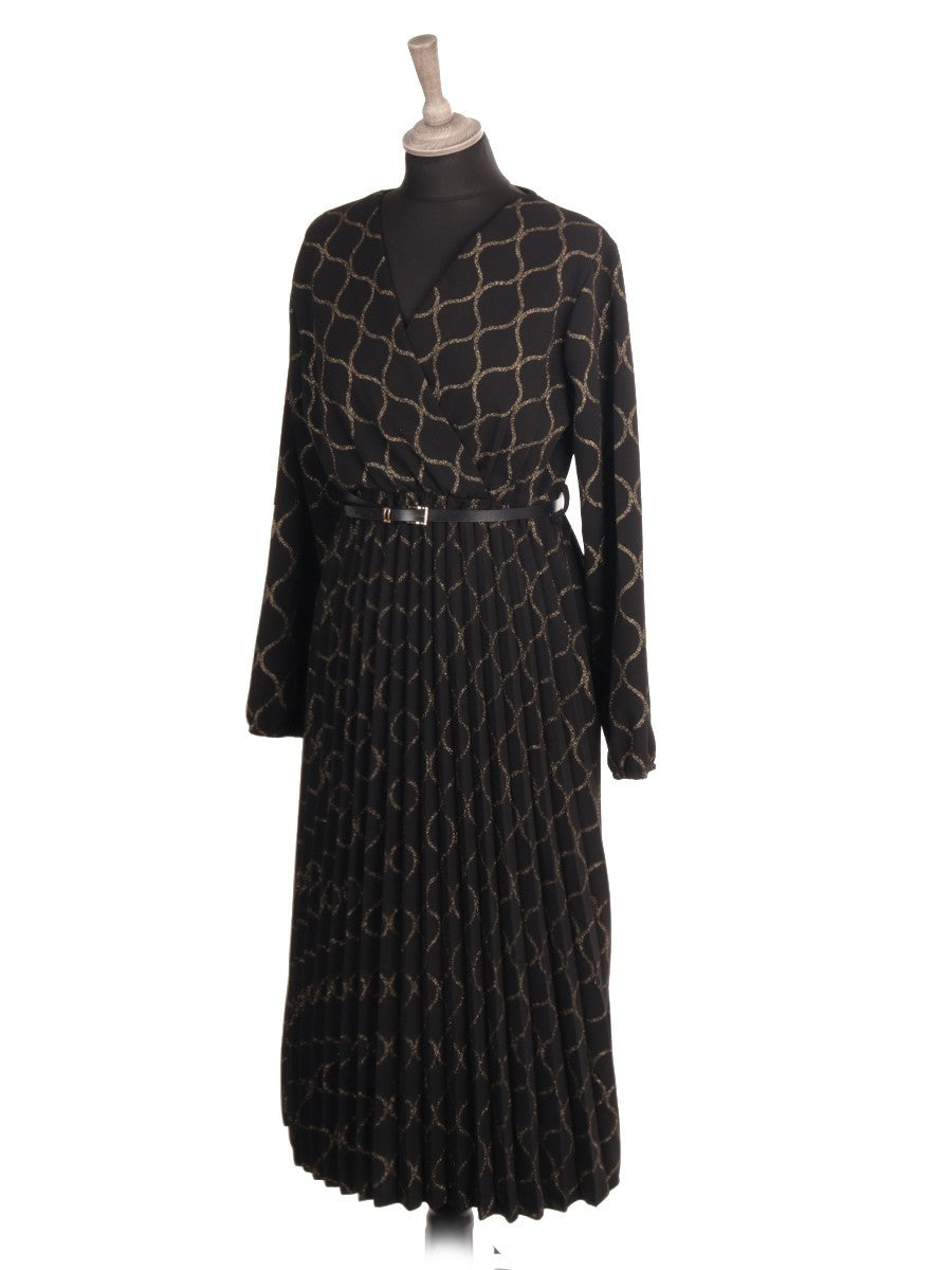 Elevate your wardrobe with this Italian wrap-over dress featuring delicate glittery details and elegant pleats. Designed with a flattering belt to accentuate your waist, it combines sophisticated style with a comfortable fit. Perfect for formal occasions or stylish evenings, this dress offers a refined silhouette and subtle shimmer that enhances your presence effortlessly.