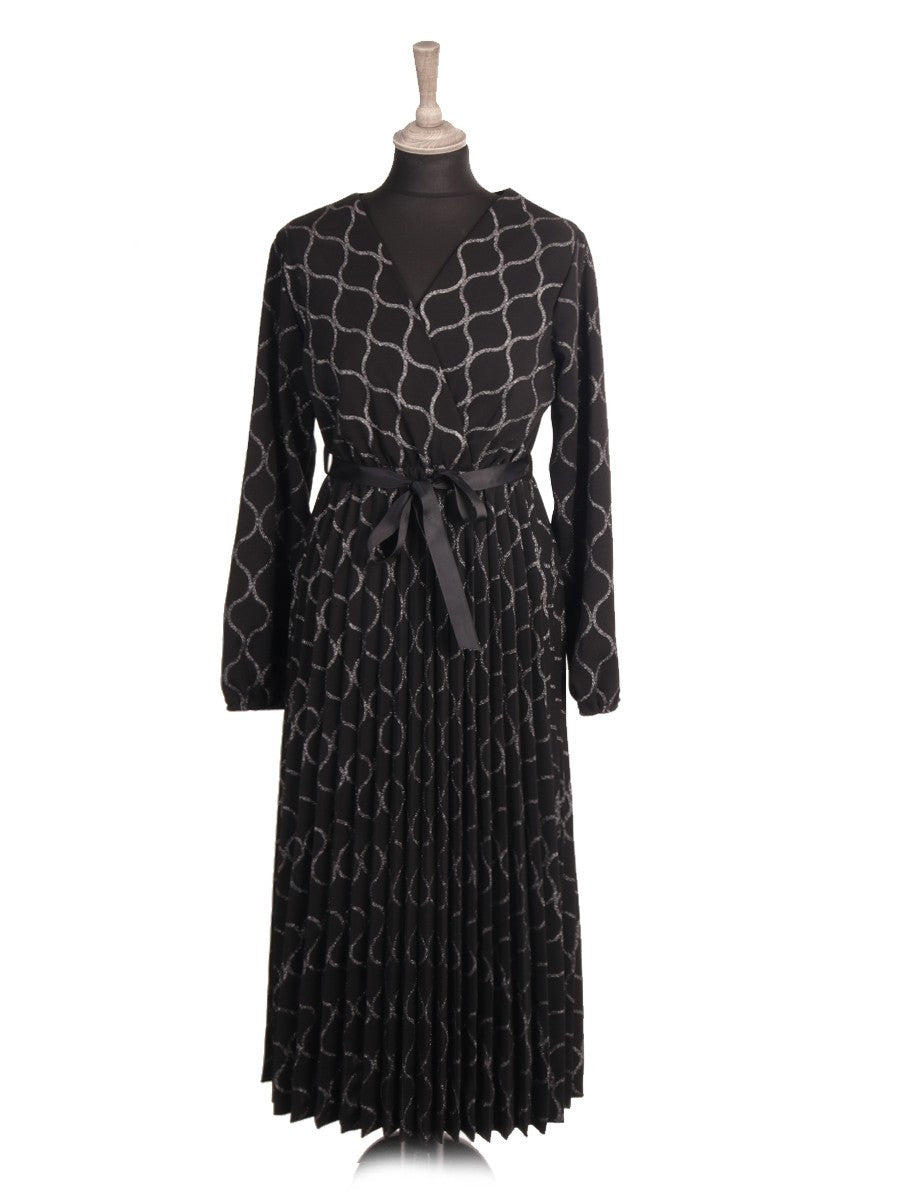 Elevate your wardrobe with this Italian wrap-over dress featuring delicate glittery details and elegant pleats. Designed with a flattering belt to accentuate your waist, it combines sophisticated style with a comfortable fit. Perfect for formal occasions or stylish evenings, this dress offers a refined silhouette and subtle shimmer that enhances your presence effortlessly.